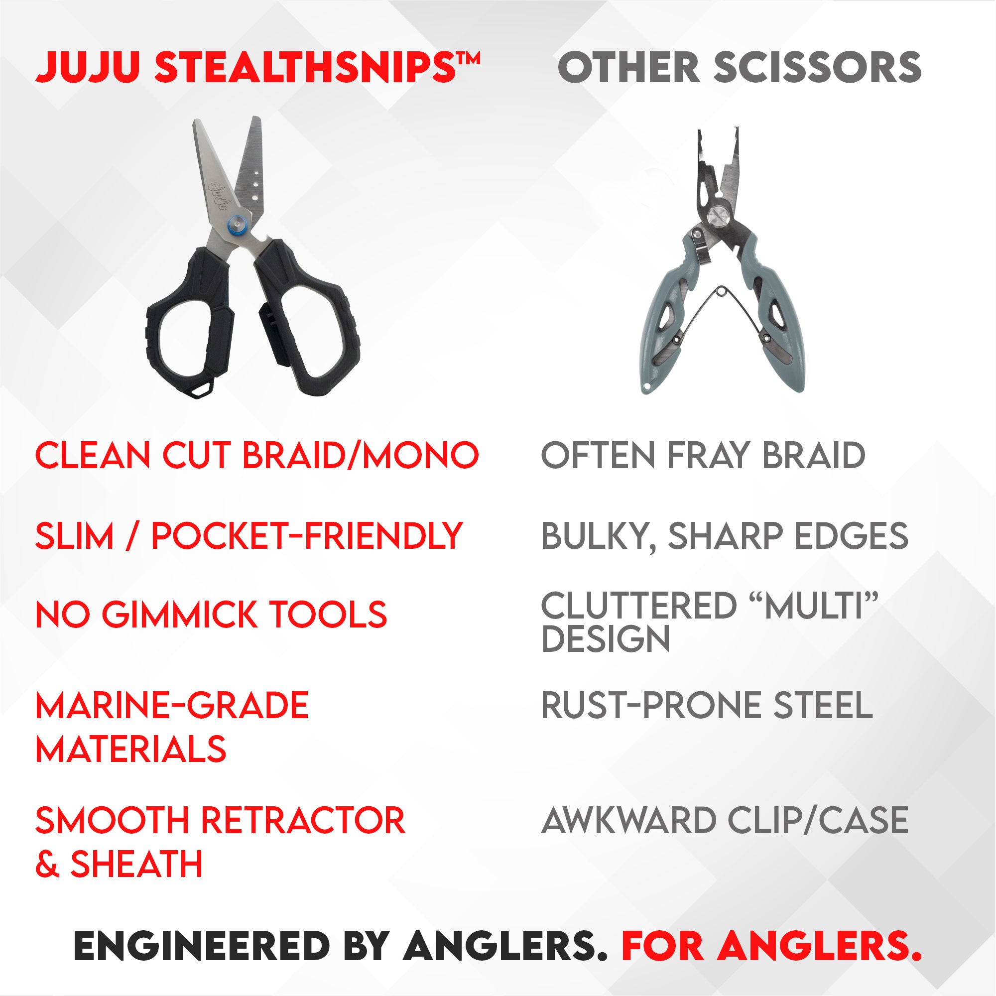 The JuJu StealthSnips are the rigging tool you never leave behind. With corrosion-resistant stainless steel blades and precision micro-serrated edges, these 6.5" shears slice through braid, mono, and fluoro like they’re not even there.